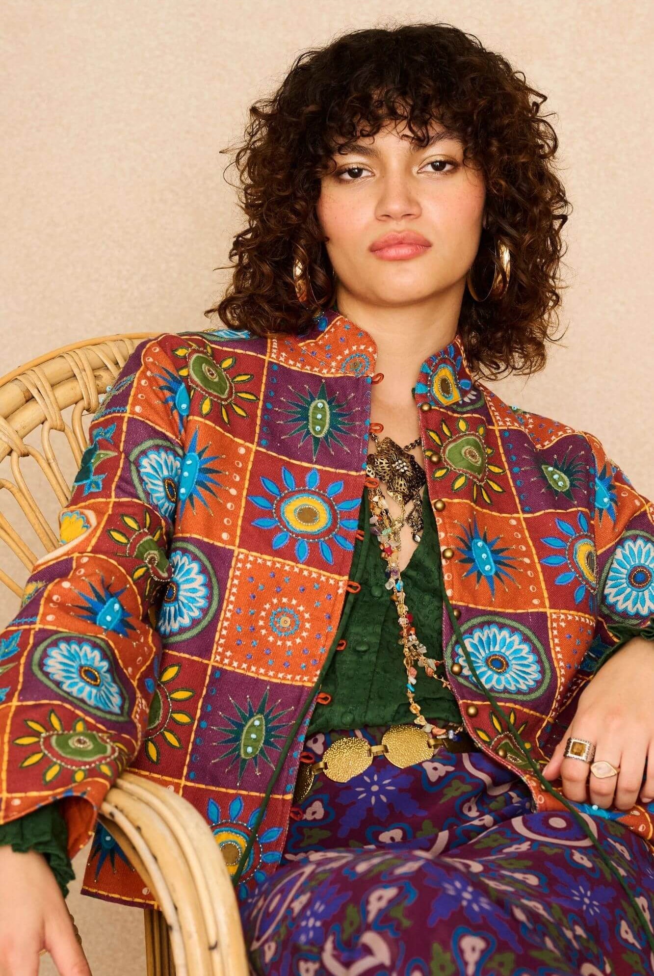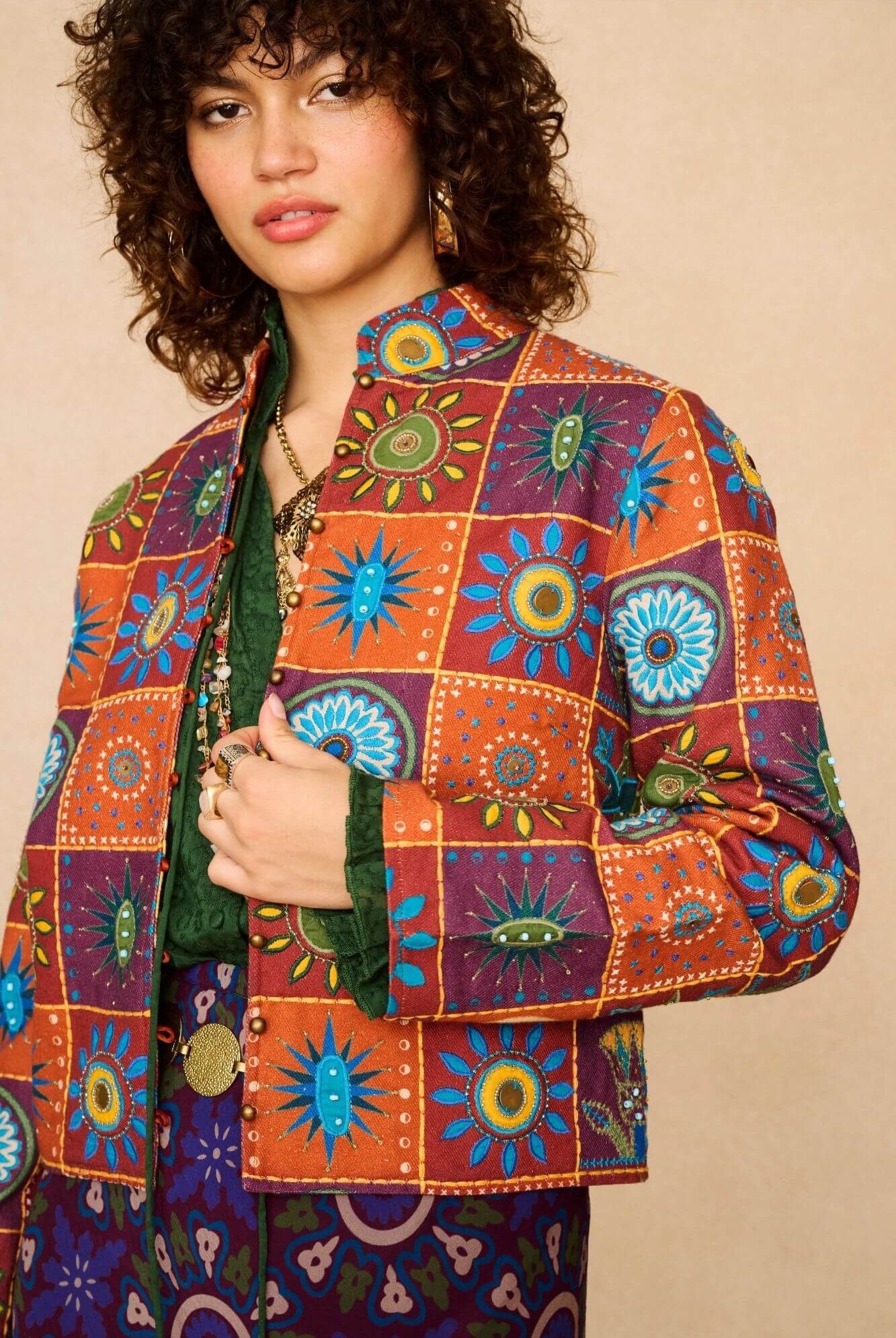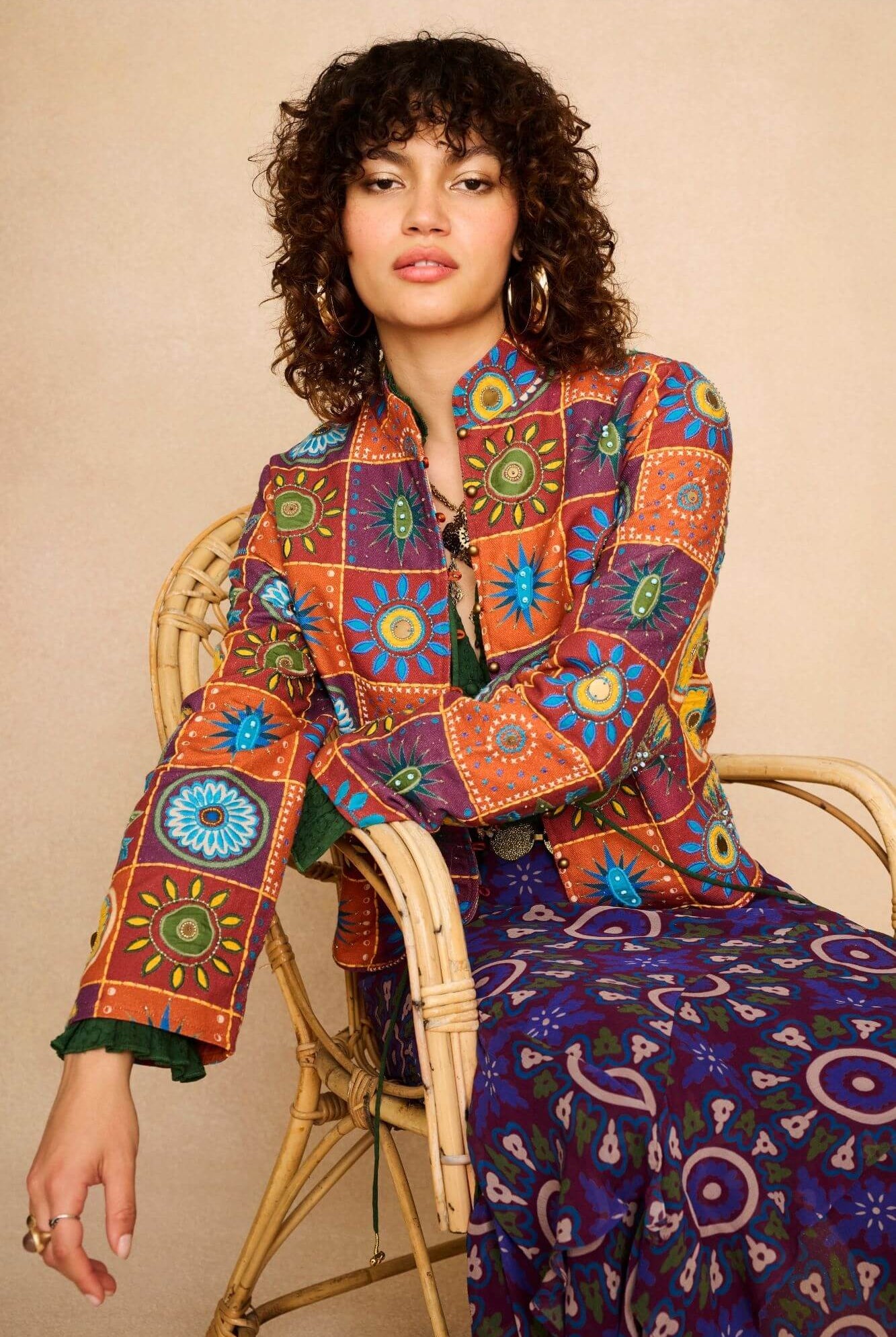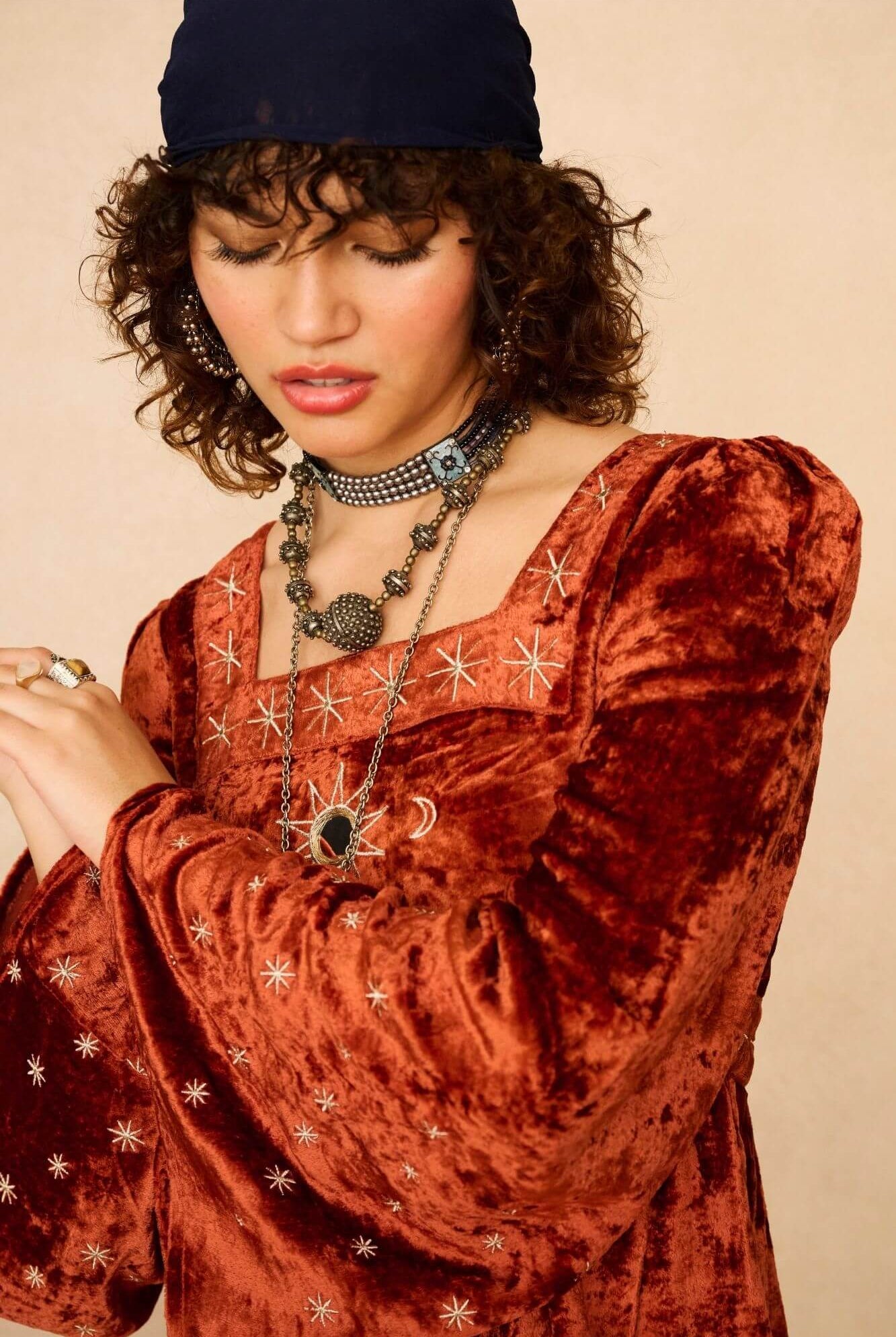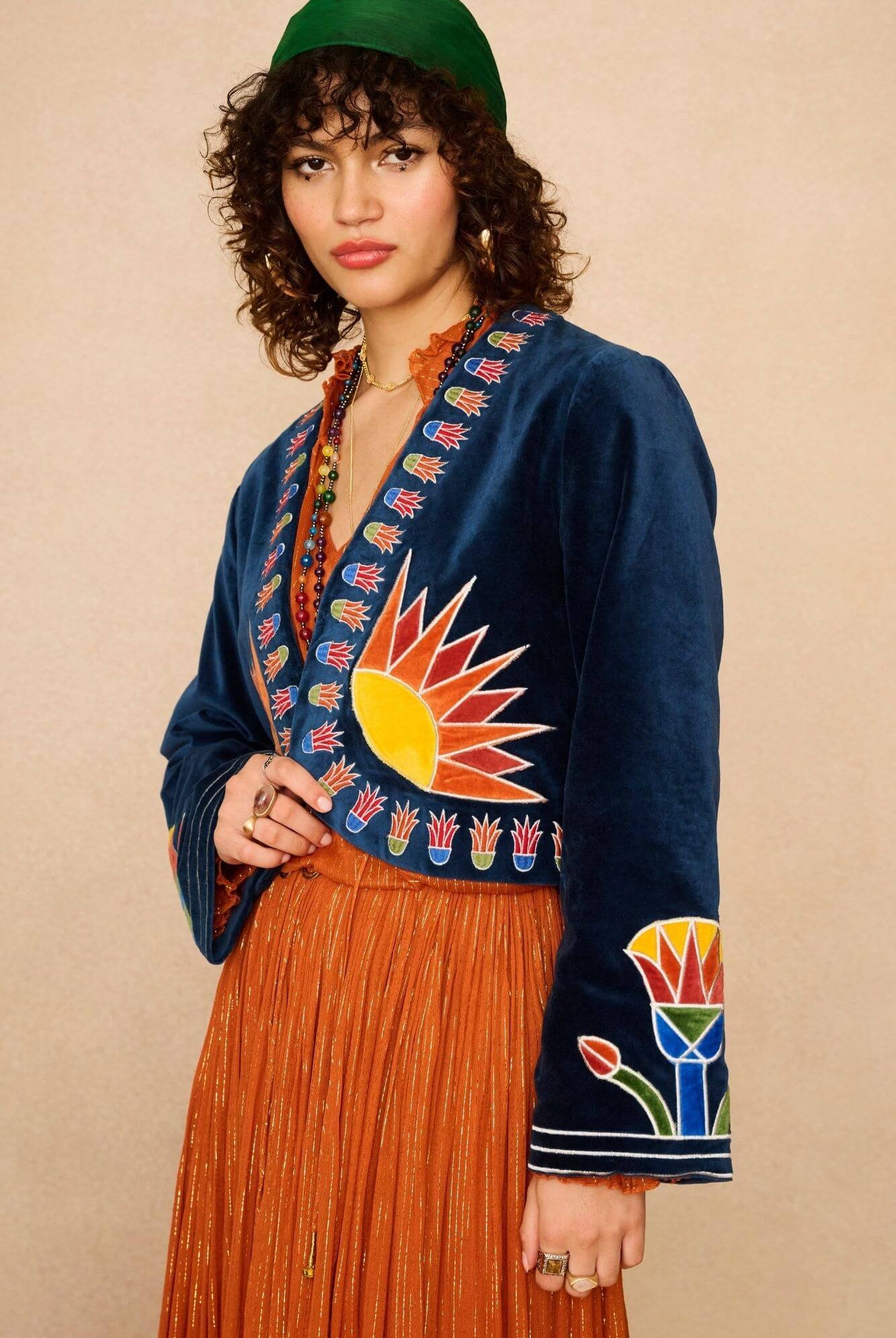 Rich navys, reds, oranges and purples create the perfect palette for abstract sun motifs and astrological symbols, while luxurious velvet and lurex meet embroidered trims and patchwork touched with gold.