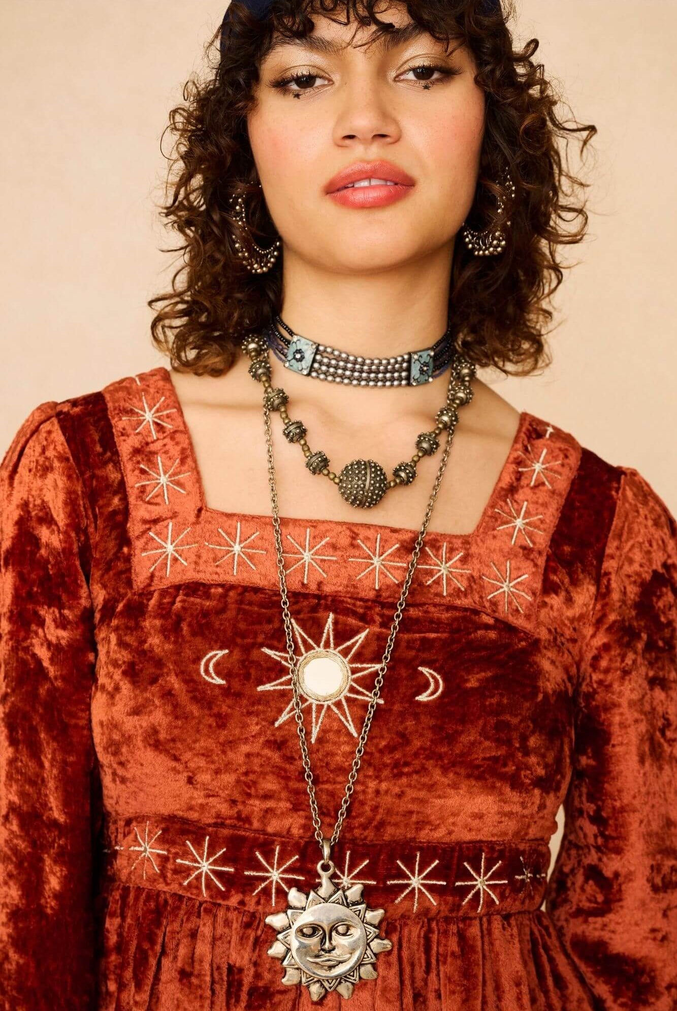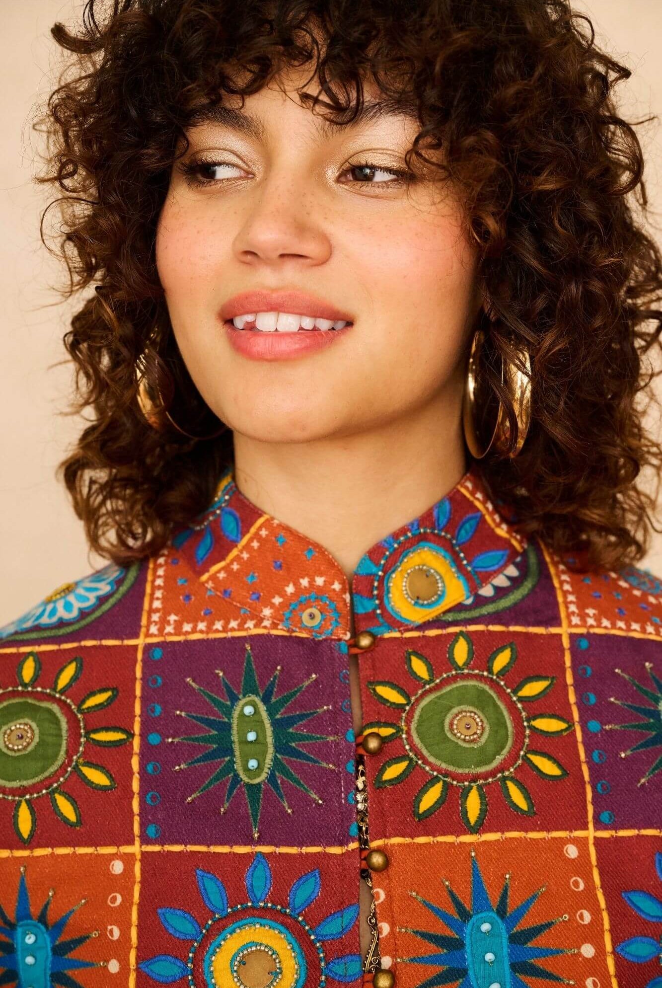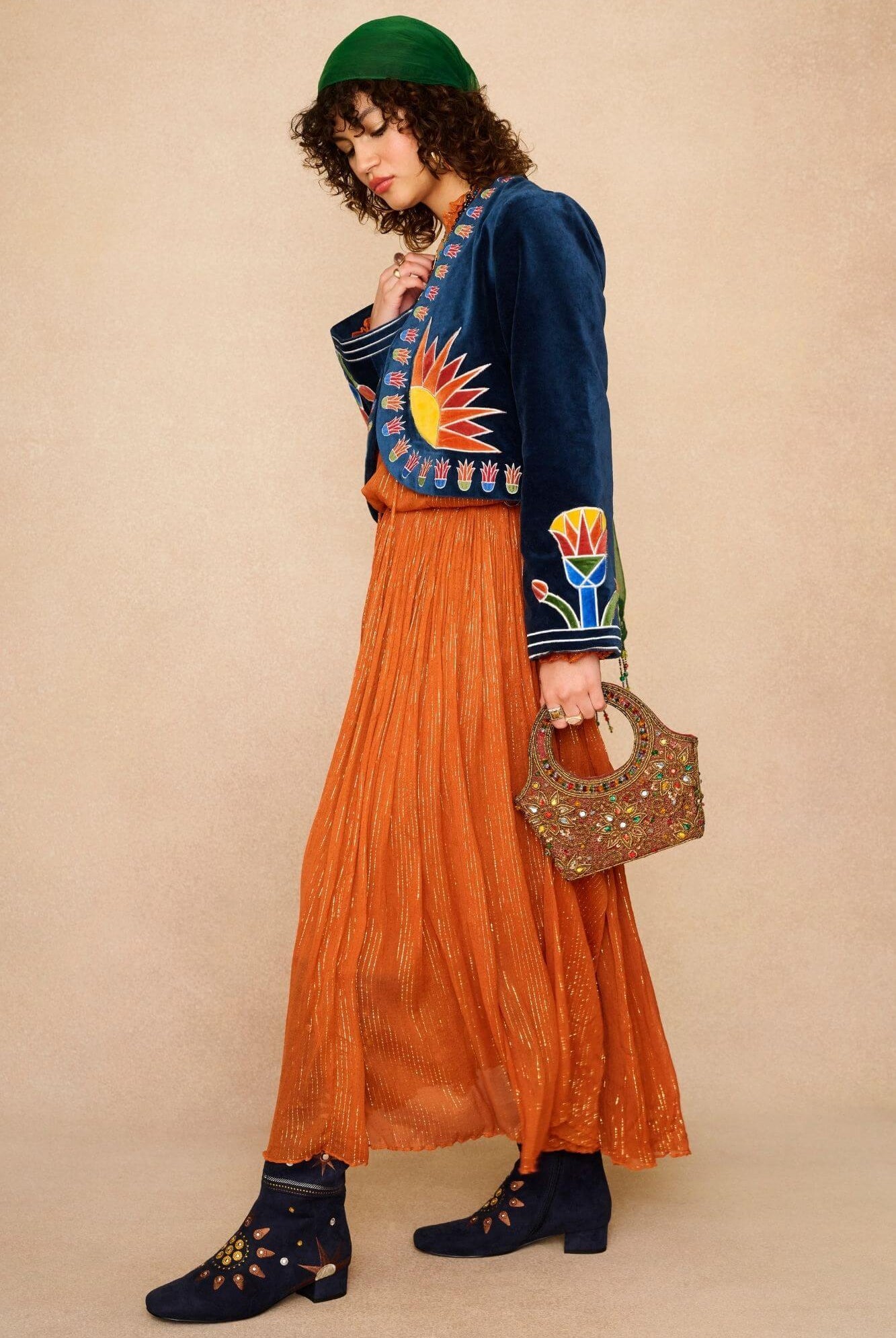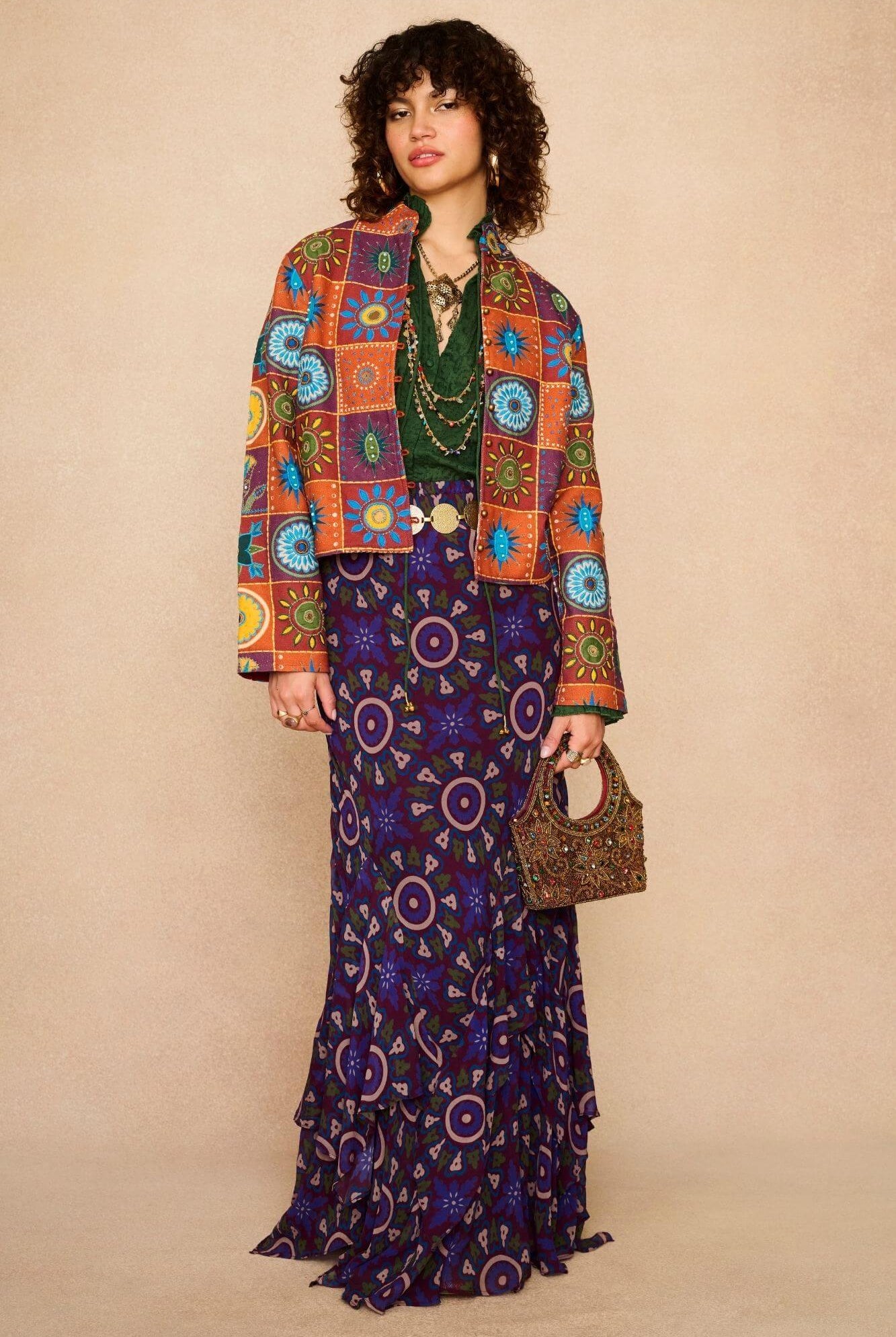 Rich navys, reds, oranges and purples create the perfect palette for abstract sun motifs and astrological symbols, while luxurious velvet and lurex meet embroidered trims and patchwork touched with gold.