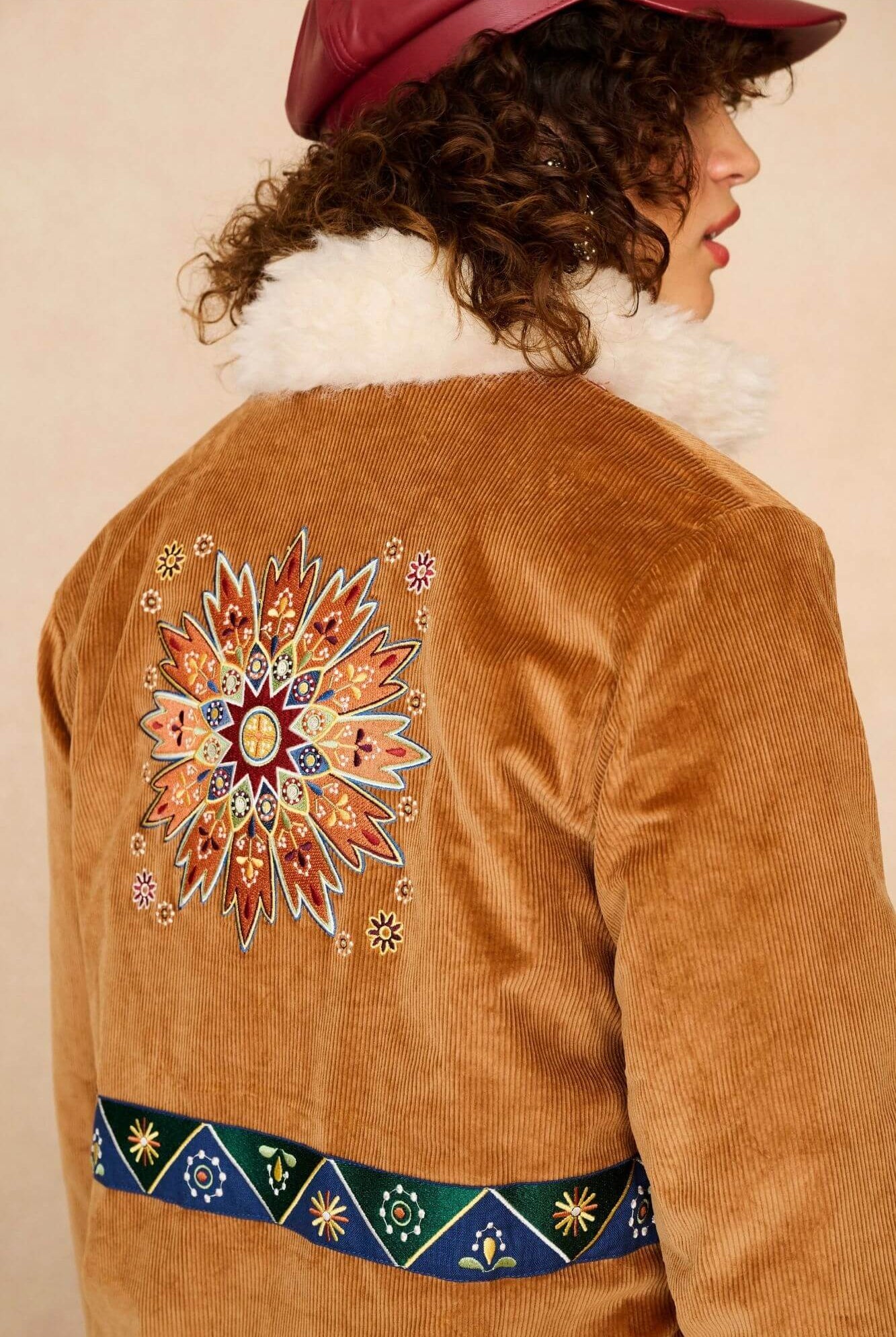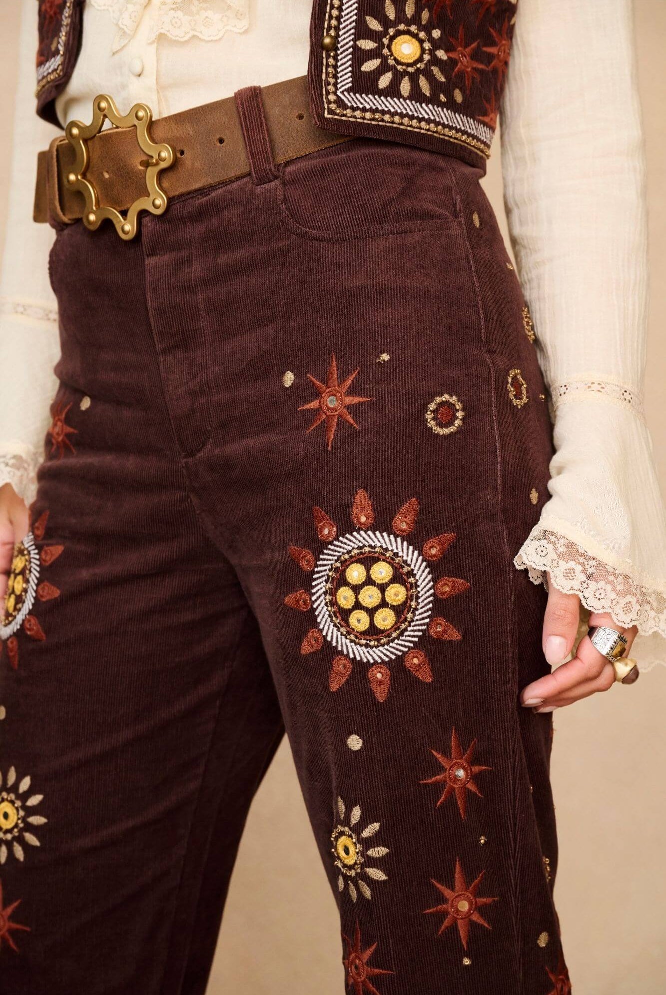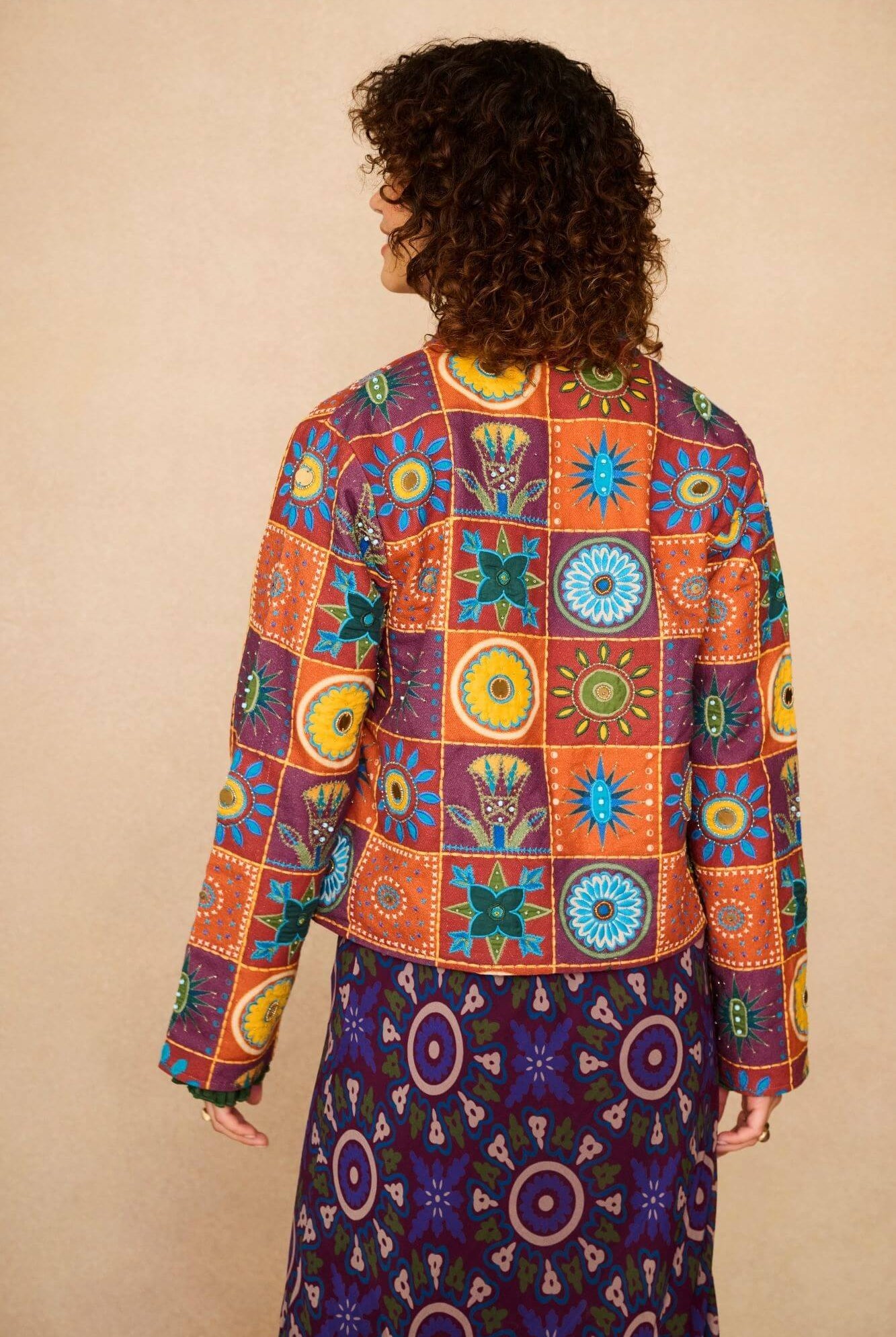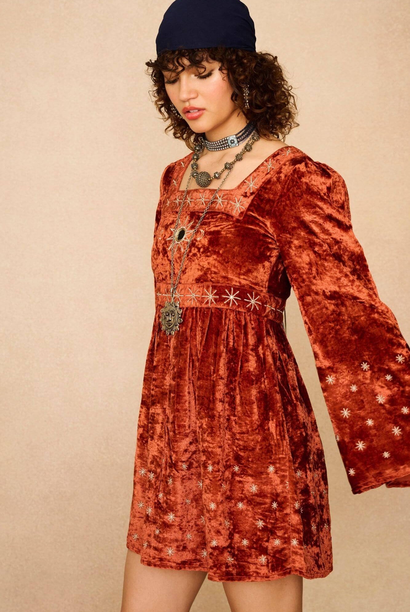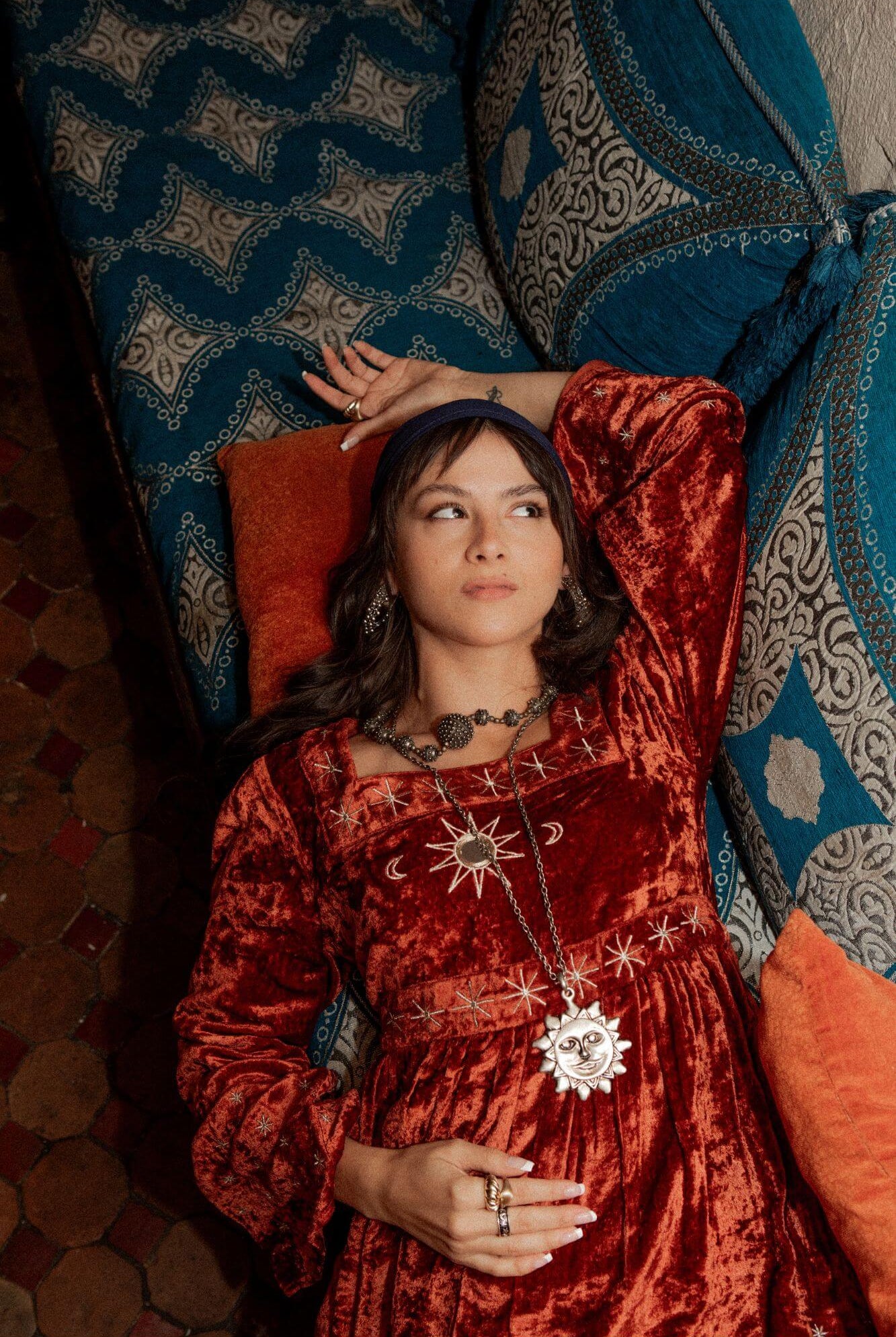 Rich navys, reds, oranges and purples create the perfect palette for abstract sun motifs and astrological symbols, while luxurious velvet and lurex meet embroidered trims and patchwork touched with gold.