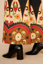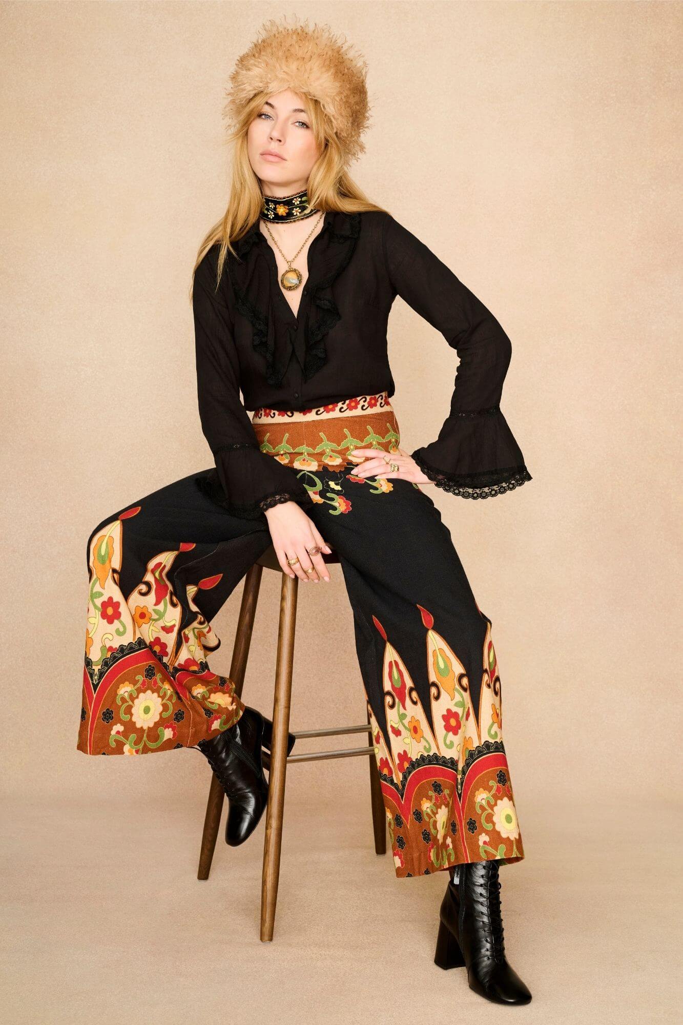 We designed our Aurelia Golden Ember Black Wide Leg Trousers to bring that unmistakable late sixties decadence into the everyday. Cut in a flowing wide leg with a soft cotton drape, they’re printed with warm golden ember motifs inspired by vintage tapestry and the ornate fabrics once worn by bohemian icons. The black base makes the colours glow, while the border placement along the hem and waistband gives a sense of structure and movement. They sit high on the waist, elongating the leg before falling into an easy, full shape that moves beautifully as you walk.