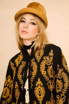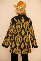 Cut from deep black cotton and covered in ornate gold embroidery, it feels like a treasure unearthed from a rock star’s wardrobe. The longline shape drapes beautifully, with a soft swing through the body and sleeves that brings instant drama to anything you wear it with. Ornate braided closures and trims finish the piece, while the bold pattern takes inspiration from vintage tapestry jackets and the fearless women who ruled London’s late-night scene.