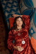 Light catches differently on the Constellation Orange Velvet Embroidered Mini Dress, making every step feel a little more special. Made from rich crushed viscose velvet, it glows in tones of deep burnt orange and is detailed with metallic star embroidery that trails across the body and sleeves. The neckline and waistband are framed with celestial motifs, while a mirrored sun and crescent moon at the centre add an authentic, hand-finished touch.