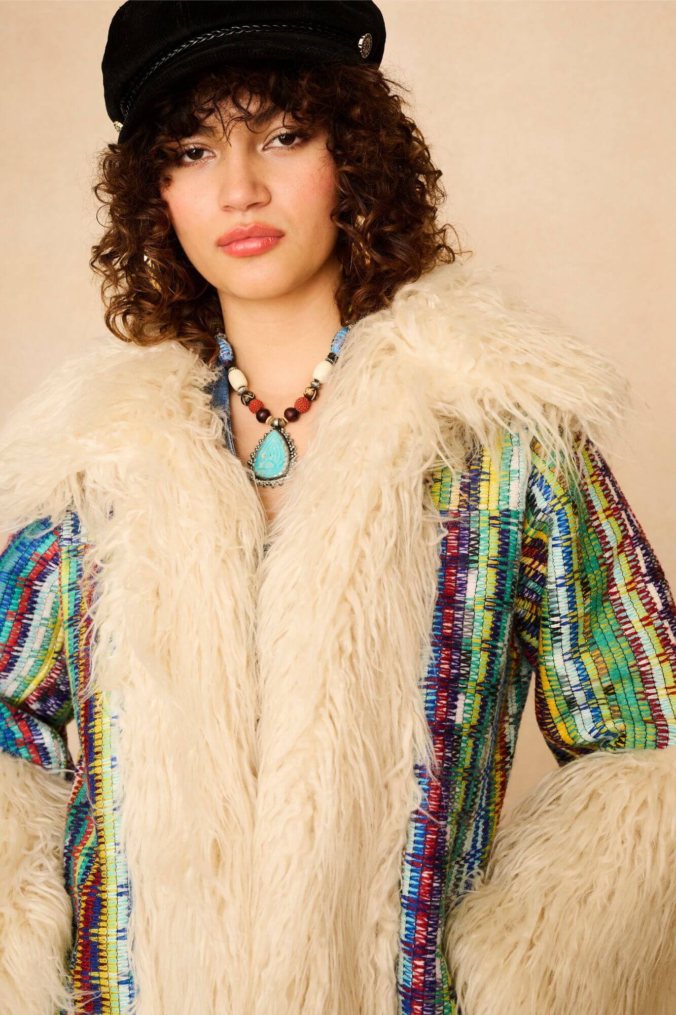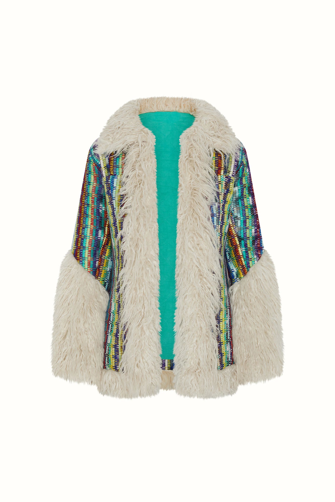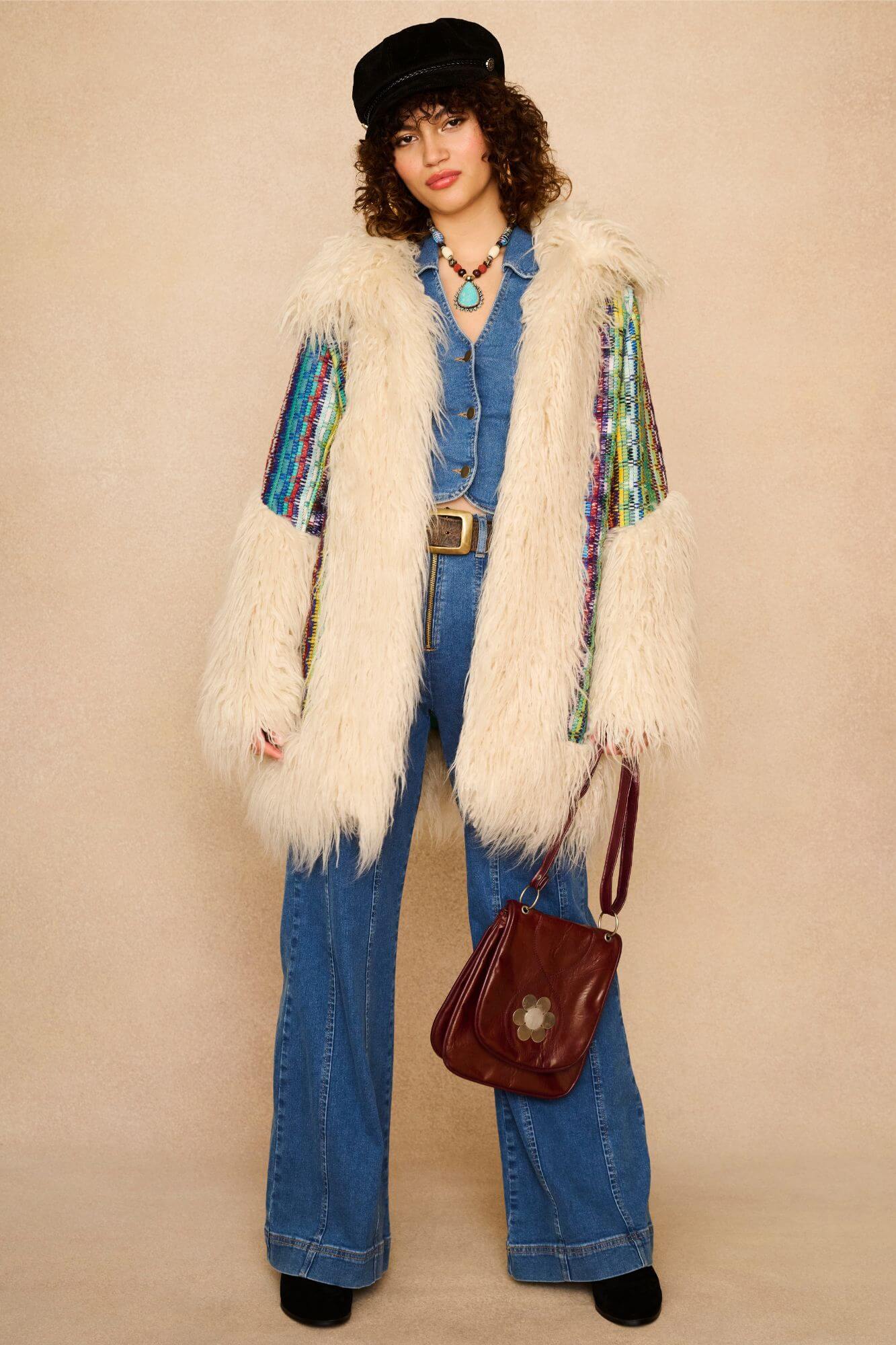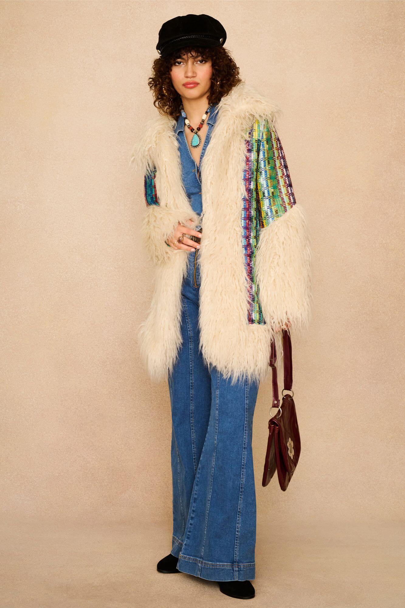 Enter your main character era with the Dreamweaver Technicolor Faux Fur Trimmed Coat. A show-stopping number that channels pure 70s sass. With its kaleidoscopic woven fabric, shaggy faux fur trims and exaggerated cuffs, it’s a love letter to playful self-expression. Inspired by a coat worn by Cher and reimagined through the Emporium lens, this statement piece brings serious icon energy – with warmth to match, thanks to its soft padded lining and hidden hook-and-eye closures.
