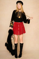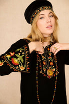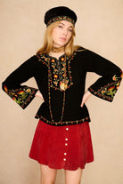 It’s an easy piece to build your look around. Pair it with our Little Jeanie Flares and boots for effortless everyday styling, or with the matching Midnight Bloom Black Embroidered Velvet Hat and Night Garden Black Embroidered Velvet Scarf when you want to go all out. For evenings, style it with our Aurelia Golden Ember Black Wide Leg Trousers and Moonflower Cream Embroidered Penny Lane Coat for a statement that still feels relaxed.