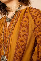 Let the Equinox Golden Panelled Embroidered Blouse bring a little sun into your wardrobe. Made from soft ochre cotton, its tonal celestial embroidery catches the light just enough to feel special, while the gathered neckline and tasselled ties add that effortless ‘70s touch. Billowing sleeves fall beautifully with movement, making it as comfortable as it is striking.