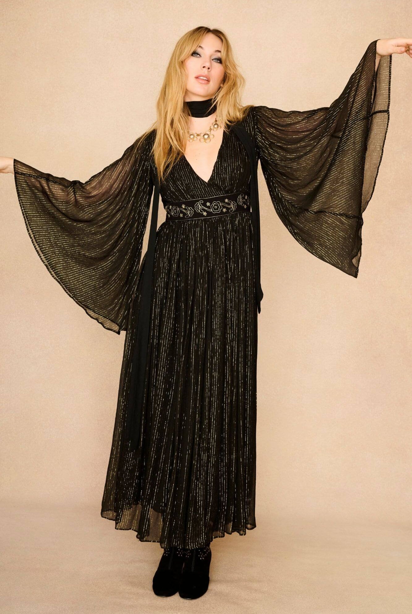 To make every outfit feel crafted, consider mixing in pieces from our wider collections. Pairing high-waisted jeans or flared trousers with your embroidered or boho dress instantly channels an authentic ‘70s vibe, giving the look depth and attitude. Sheer dresses can be layered over a statement top or blouse for extra texture and coverage, allowing unexpected colours and patterns to peek through. The Heroes collection is packed with standout pieces - embroidered boots, velvet vests, cropped blouses - that complement our dresses beautifully. The secret to mastering this style is focusing on fabrics, proportions and accessories that work together to build a bohemian, layered silhouette.