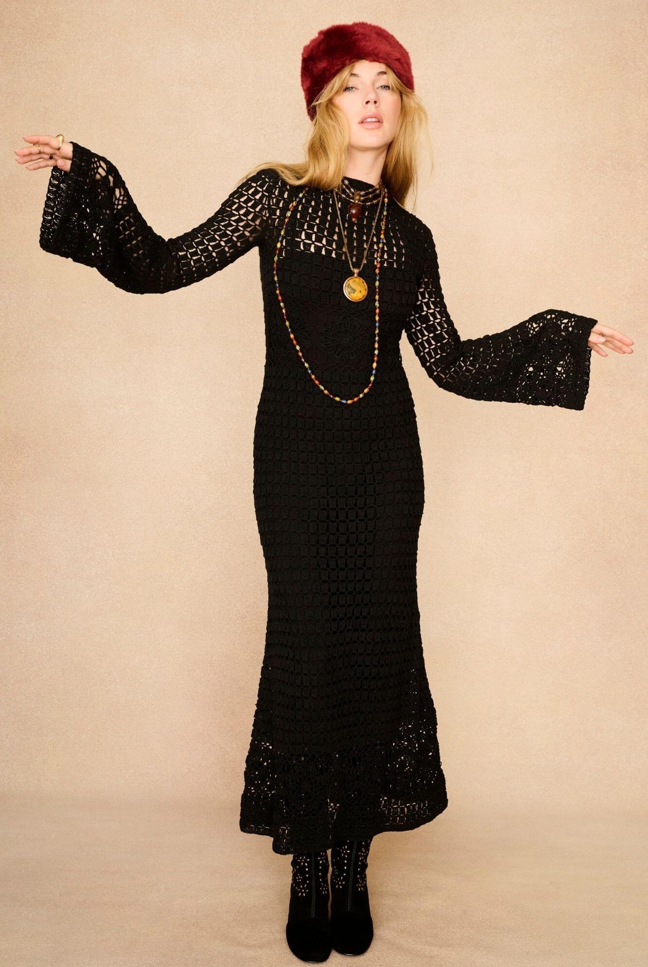 To make every outfit feel crafted, consider mixing in pieces from our wider collections. Pairing high-waisted jeans or flared trousers with your embroidered or boho dress instantly channels an authentic ‘70s vibe, giving the look depth and attitude. Sheer dresses can be layered over a statement top or blouse for extra texture and coverage, allowing unexpected colours and patterns to peek through. The Heroes collection is packed with standout pieces - embroidered boots, velvet vests, cropped blouses - that complement our dresses beautifully. The secret to mastering this style is focusing on fabrics, proportions and accessories that work together to build a bohemian, layered silhouette.