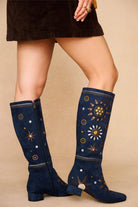 Step into something a little spellbinding. The Midnight Blue Embroidered Boots bring a touch of celestial magic to every look, crafted from soft faux suede in a deep midnight hue. Their classic ’70s block-heeled shape and calf-length fit make them endlessly flattering, while the starburst embroidery glows in rich tones of orange, yellow and off-white, finished with tiny silver studs that catch the light with every step.