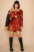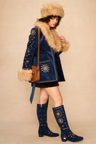Designed to pair perfectly with the matching Midnight Blue Embroidered Penny Lane Coat, these boots are made for statement styling. Go full cosmic co-ord layered with the Constellation Orange Velvet Mini Dress, or let them shine on their own peeking from under the Phoenix Orange Lurex Midi. Whether you’re treasure hunting at a vintage market or heading out to dance the night away, they’re the kind of boots Anita Pallenberg or Grace Slick would never take off.