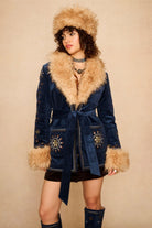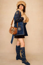 The Midnight Blue Embroidered Penny Lane Coat casts a little spell from the moment you slip it on. Crafted from soft cotton corduroy in a rich midnight hue, it’s trimmed with plush beige faux fur at the collar and cuffs for a touch of warmth and texture. Celestial embroidery in glowing tones of orange, yellow, off-white and silver lurex shimmers across the shoulders, pockets and back, capturing the magic of autumn nights. With its classic belted silhouette and deep front pockets, it’s a timeless ’70s-inspired coat designed to bring out your inner muse.