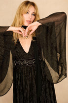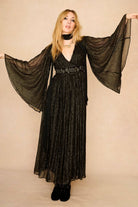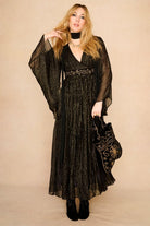 Step into the spotlight in our Night Moves Black Lurex Maxi Dress. Designed to bring pure seventies glamour into the heart of the collection, it’s made from soft black lurex that glimmers as you move, with a fluid, pleated silhouette that feels both dramatic and effortless. The wrap front creates a deep, flattering neckline, while wide flowing sleeves add movement and grace. At the waist, intricate embroidery draws the eye and defines the shape, bringing a touch of vintage artistry to the look.