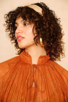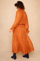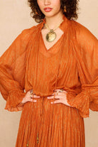 There’s something instantly uplifting about the Phoenix Orange Lurex Midi Dress. Its burnt orange chiffon shimmers softly in the light, woven with fine lurex that gives it that golden glow. The shape is beautifully romantic, with a high gathered neckline, elasticated waist and floaty sleeves finished with delicate ties and tiny golden bells. It includes a soft stretch slip for coverage, making it easy to wear day or night.