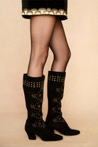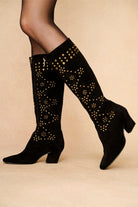 Nothing says confidence like our Rebel Revolver Black Studded Long Boots. Crafted from soft black faux suede and detailed with bold gold studs, they channel the tall statement boots that defined late-sixties and early-seventies style. The shape is sleek through the leg with a comfortable block heel that gives height without sacrificing ease, while the stud pattern wraps elegantly around the front and sides to add impact without overpowering your look. A front zip closure makes them easy to slip on and off, ready for wherever the night takes you.