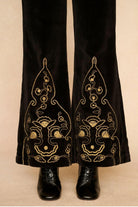 We designed our Smoke & Gold Black Embroidered Velvet Trousers to add a little rock-and-roll grandeur to every outfit. Cut from plush black cotton velvet and finished with sweeping smoke and gold embroidery curling around the hems and pockets, they nod to the ornate detailing found on vintage parade jackets and sixties stagewear. The high waist creates a long, clean line through the leg before opening into a soft flare that sits perfectly over a boot. They’re the kind of piece that turns a simple outfit into something unforgettable.