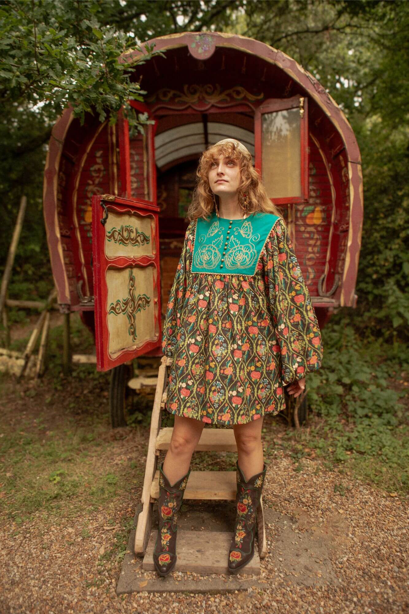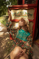 Let your wardrobe weave a little spell with the Some Kind of Magic Embroidered Mini Dress – a jewel-toned vision with a teal yoke waistcoat, hand-finished in golden ari embroidery across the chest and back, and framed with matching buttons and trim. The flowing skirt blooms with our floral vine print, while voluminous balloon sleeves gather softly at the cuffs for a touch of drama. Crafted from a textured cotton–viscose blend, it’s a piece that carries you gracefully from warm autumn afternoons to candlelit evenings.